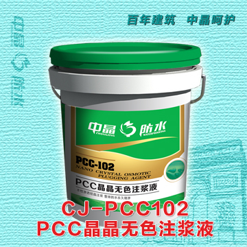 中晶PCC102晶晶无色注浆液是由多种纳米高分子材料和其它无机分子材料,依水为载体通过注浆渗透到水泥砂浆或混凝土缝隙中形成凝胶状防水结晶物,充实缝隙和毛细孔达到防水防渗效果,此制剂因依水为载体,其渗透结晶防水可渗到最大面积基层,形成整体防水层。其化合物质在不失水的状态下,多年以后在砂浆混凝土层中可再次与水反应形成防水结晶体,在结晶的作用下能自行修补愈合,具有多次抗渗防水的能力,从本质上改善了普通砂浆混凝土结构体系的不稳定带来的再次裂渗。是目前建筑物墙地面、屋面,不破坏面层通过注浆而达到防水目的较为理想的水性注浆液。